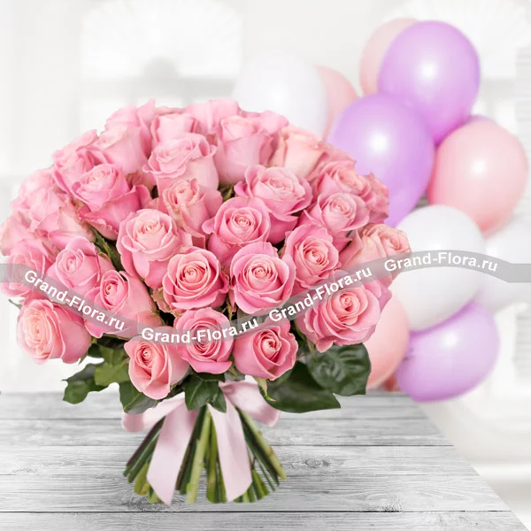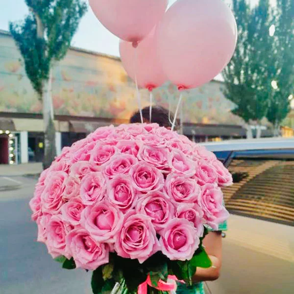 Роза розовая 60 см - 51 шт., лента + 3 шарика в подарок.